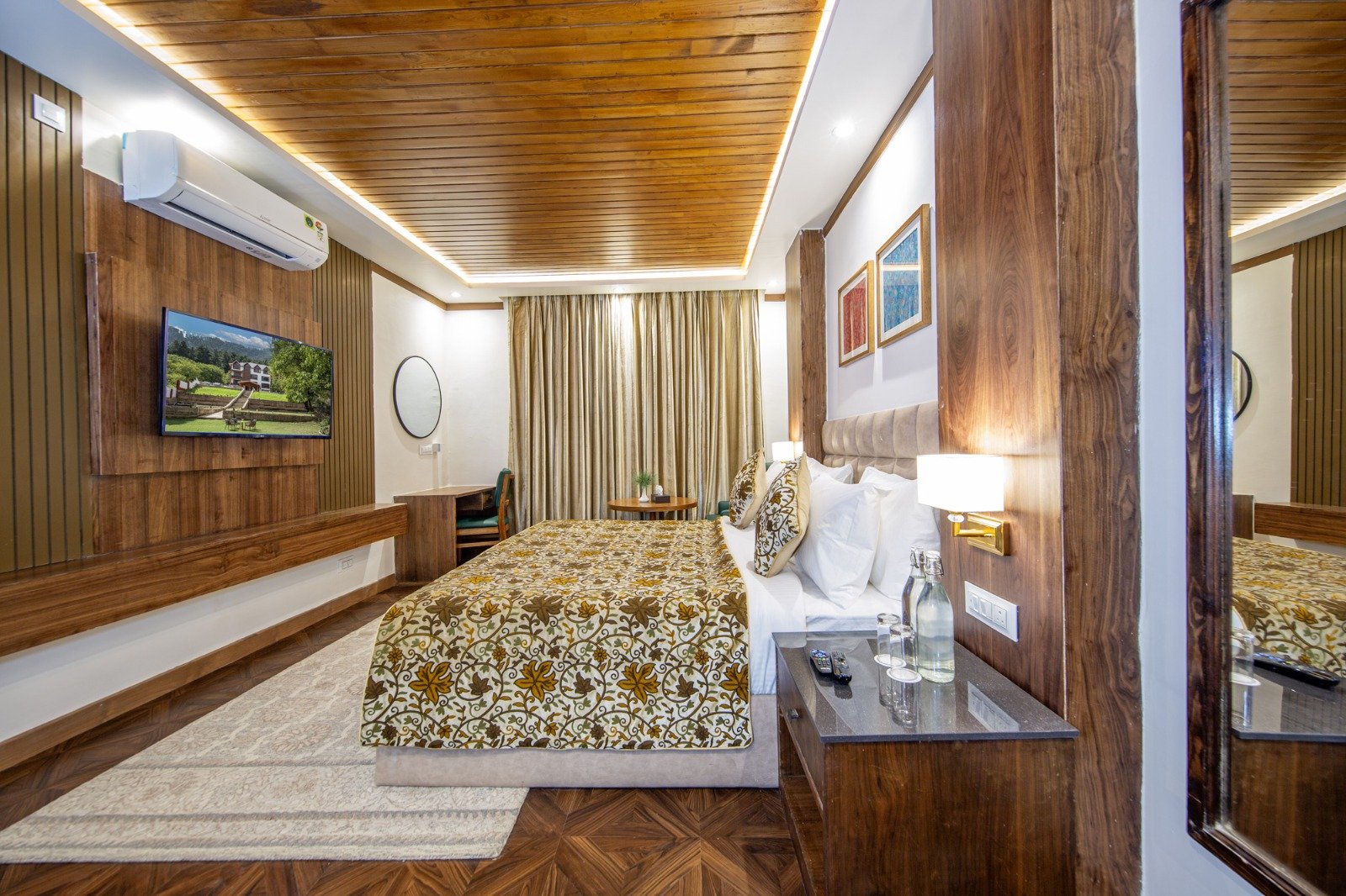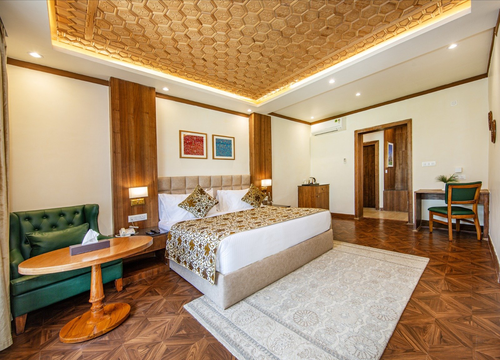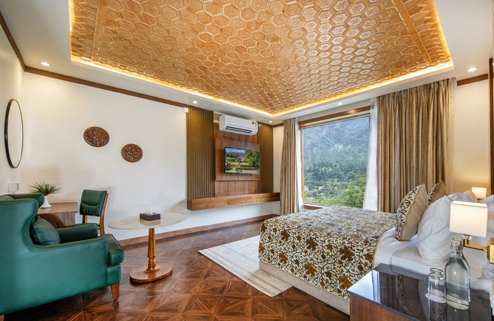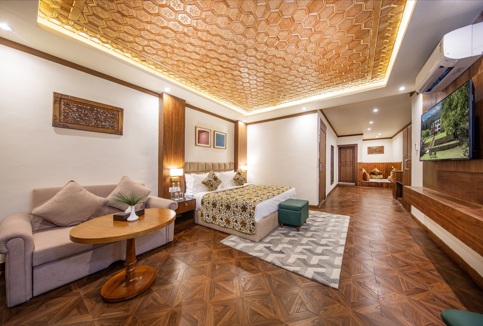 Our Luxury Bedroom with balcony offers spacious accommodations, featuring stunning views and modern amenities, ensuring a memorable stay in the heart of Pahalgam.